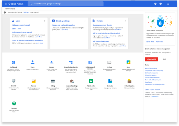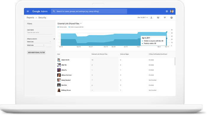 Google Workspace offers administrators enterprise control over system configuration and application settings – all in a dashboard that you can use to streamline authentication, asset protection, and operational control. Use integrated Cloud Identity features to manage users and enforce multi-factor authentication and security keys for added protection. You can choose the Google Workspace edition that best meets your organization’s security needs.
